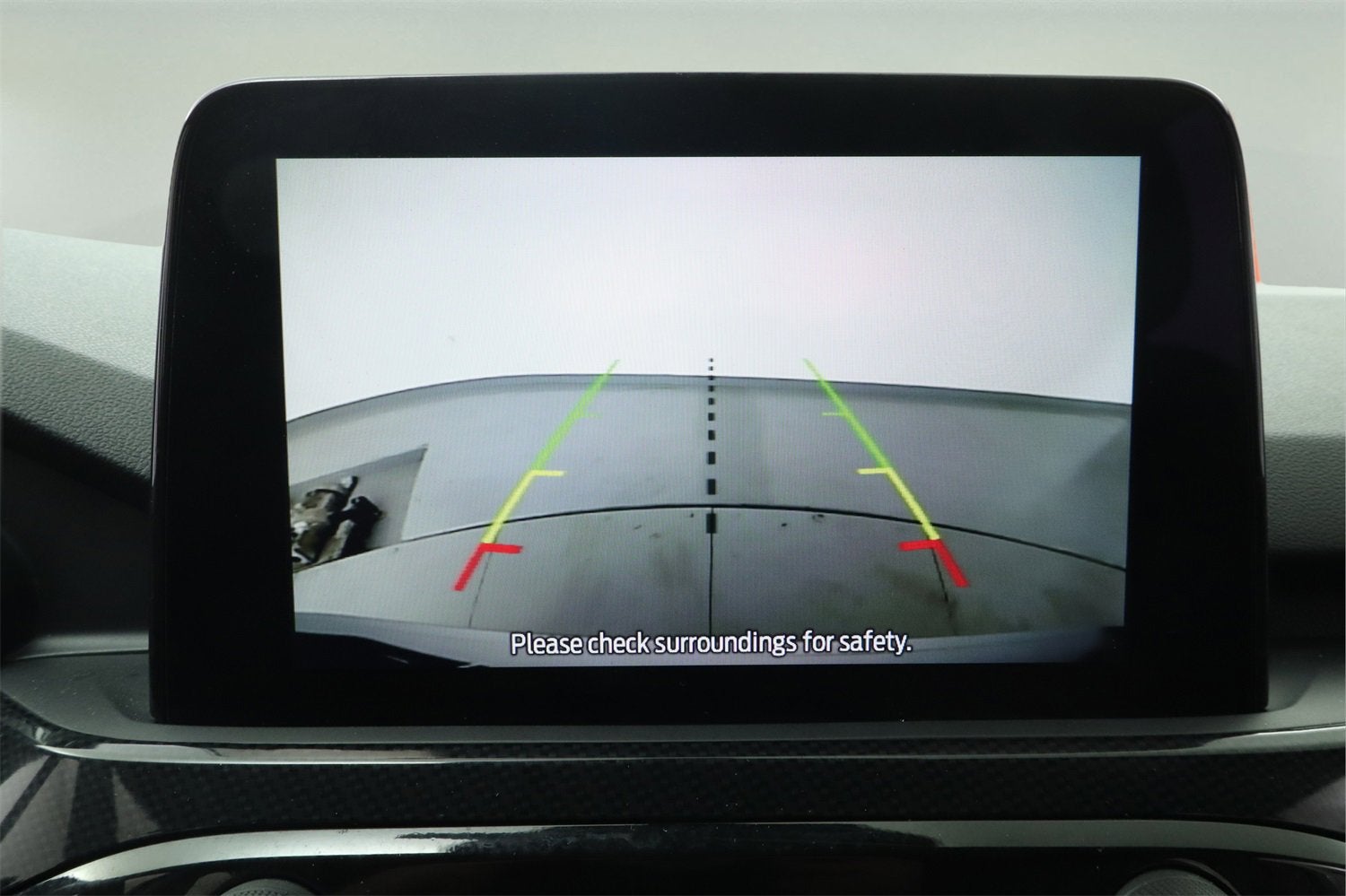 The ST-Line trim gives you sporty styling cues: all-black interior with red contrast stitching, flat-bottom steering wheel.